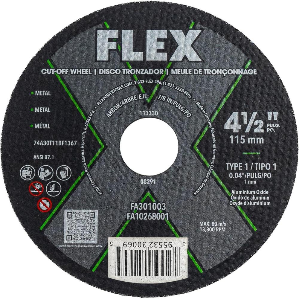 Power through bolts, padlocks, threaded rod, and excess plate steel with the FLEX 4-1/2” Cut-Off Wheel Type 1. Designed for deep cutting, this Type 1 cut-off disc delivers a larger cutting surface for less interference with the workpiece when cutting. It’s designed to reduce vibration for smooth, efficient cuts with minimal walking of the disc. The cut-off wheel features an aluminum oxide grain to cut through material quickly without generating excessive heat, and its water-resistant disc coating slows moisture exposure for extended life. Designed for metal cutting applications, the FLEX 4-1/2” Cut-Off Wheel Type 1 slices through steel, carbon steel, and cast iron.